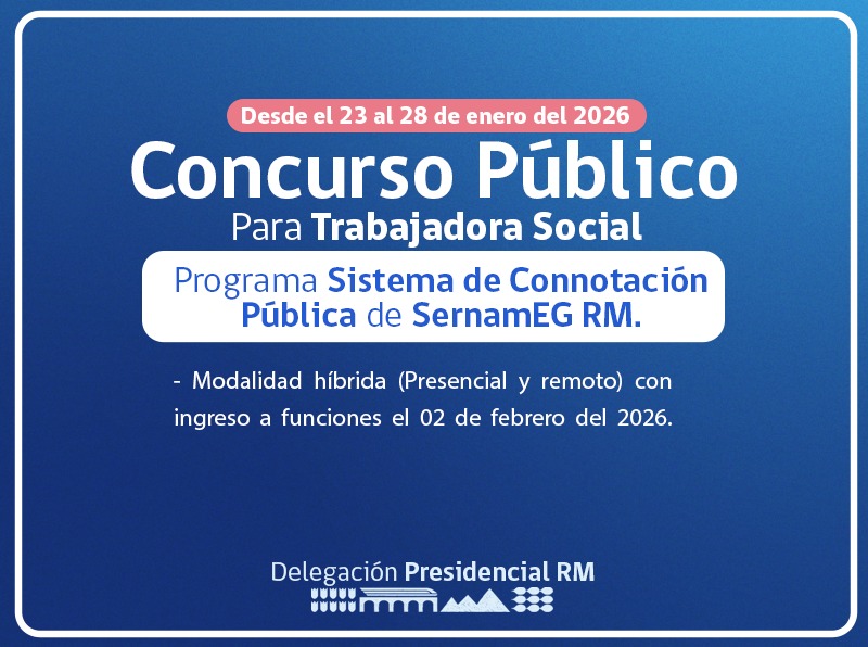 La Delegación Presidencial Metropolitana, en coordinación con SernamEG Región Metropolitana, invita a postular al concurso público para proveer el cargo de Trabajadora Social en el marco del Programa Sistema de Connotación Pública, orientado a la atención, seguimiento y coordinación de casos de violencia de género de alto impacto público.
